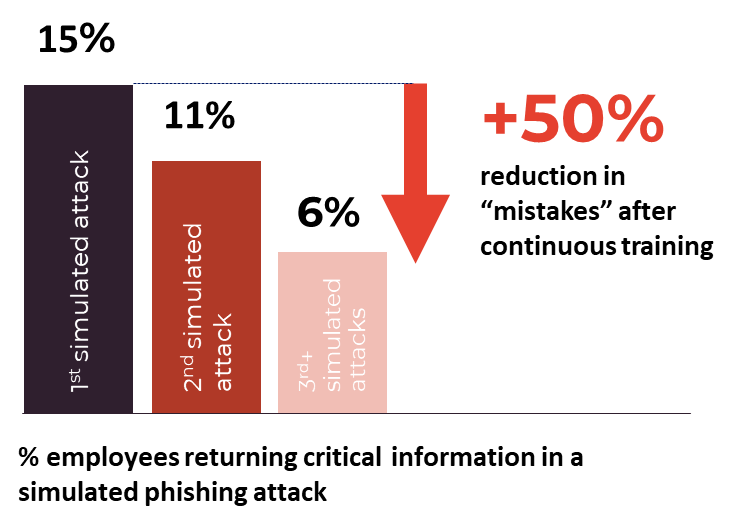Unsere Forschungen haben ergeben, dass nach kontinuierlichem Awareness-Training und Phishing-Tests, unsere Nutzer*innen eine Abnahme in Fehlern von 50% bei simulierten Phishing-Angriffen feststellen konnten.